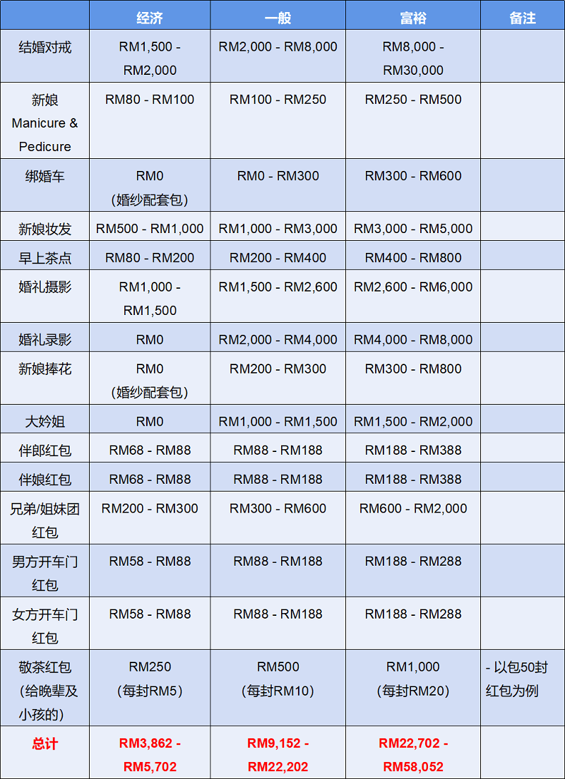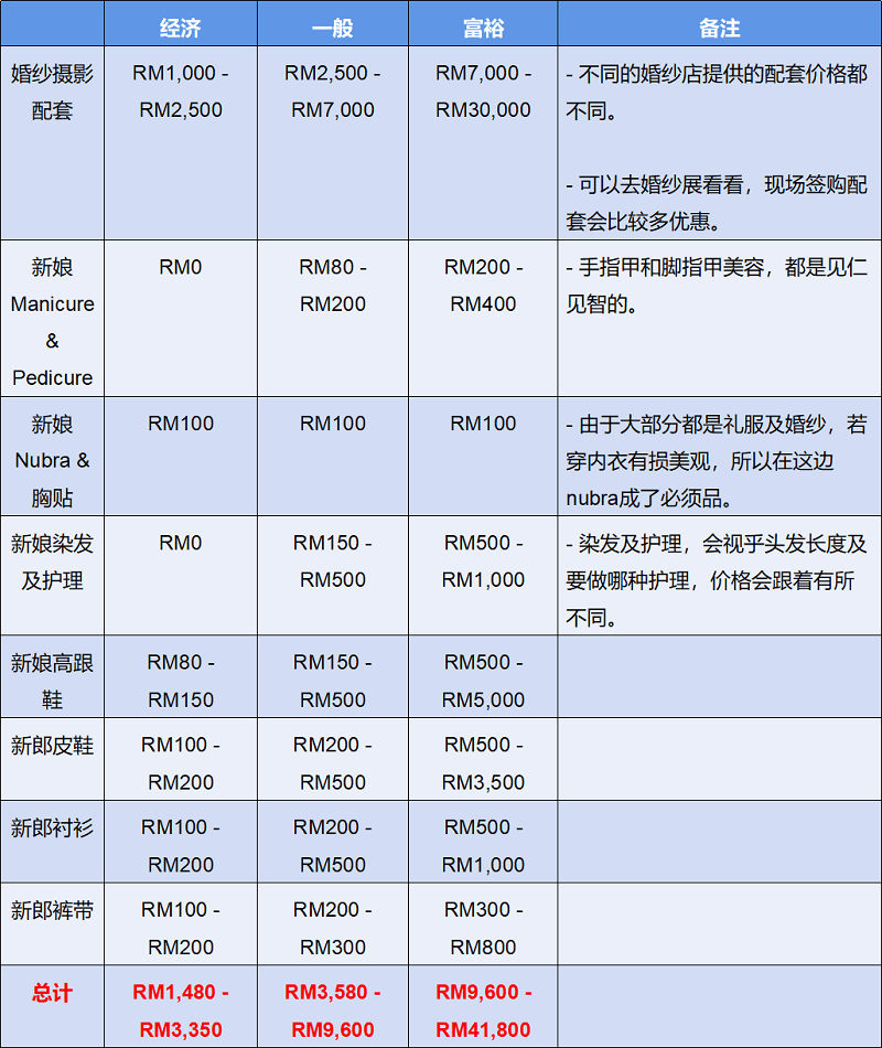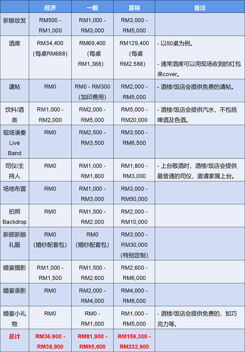 千万不要被以上的金额吓到,上面列出来的项目及价格,主要是给大家参考及心理有个底,毕竟筹备一场婚礼的花费是因人而异的。