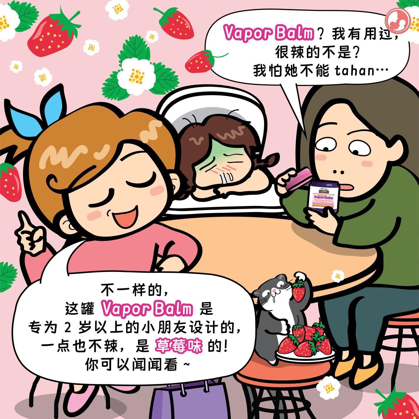 ❤️ MamaClub:不一样的,这罐 Vapor Balm 是专为 2 岁以上的小朋友设计的,一点也不辣,是草莓味的!你可以闻闻看~