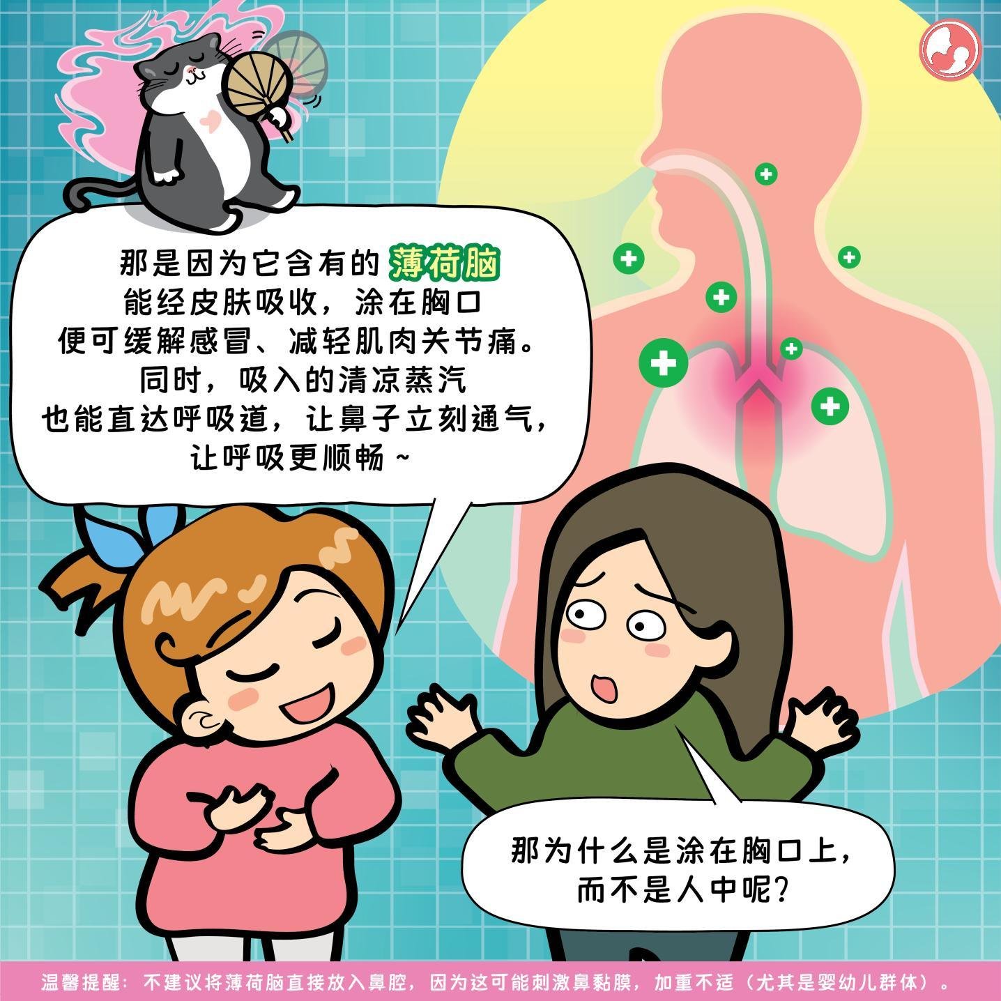 ❤️ MamaClub:那是因为它含有的薄荷脑能经皮肤吸收,涂在胸口便可缓解感冒、减轻肌肉关节痛。同时,吸入的清凉蒸汽也能直达呼吸道,让鼻子立刻通气,让呼吸更顺畅~