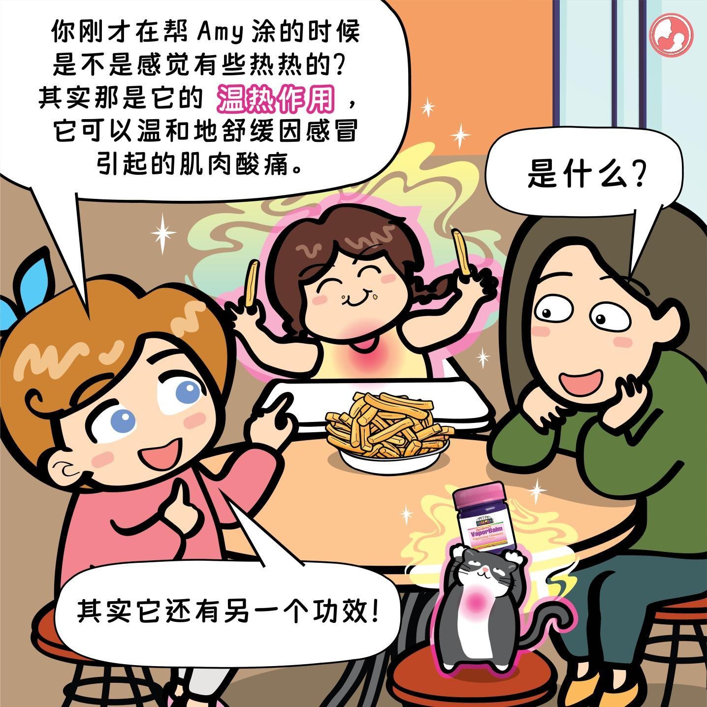 ❤️ MamaClub:你刚才在帮 Amy 涂的时候是不是感觉有些热热的?其实那是它的温热作用,它可以温和地舒缓因感冒引起的肌肉酸痛。