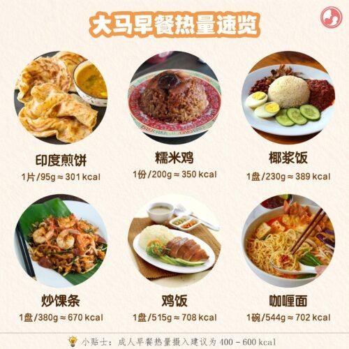 而一碗咖喱面或一份鸡饭,热量大约在 700 kcal 左右,已经超过一顿早餐的建议摄取量。