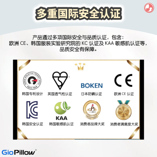 产品通过多项国际安全与品质认证,包含欧洲 CE、韩国服装实验研究院的 KC 认证及 KAA 敏感肌认证等。